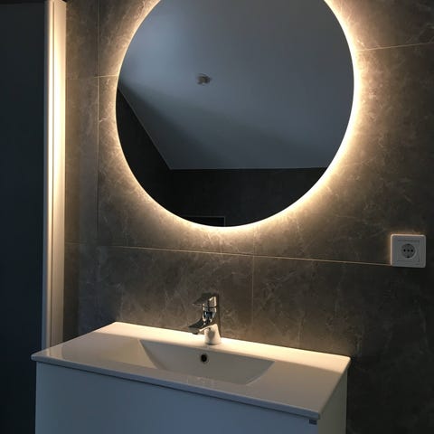 Helt ny badrumsspegel, rund 40cm med ledbelysning bakom. Touchstyrning och dimmer. Stickkontakt.