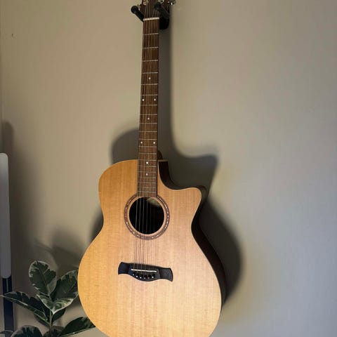 Cordoba 14 Maple akustisk gitarr med inbyggd elektronik för förstärkning. Gitarren har en naturlig träfinish med klanghål och stämskruvar i huvudet. Designad för att spela akustiskt och elektriskt.