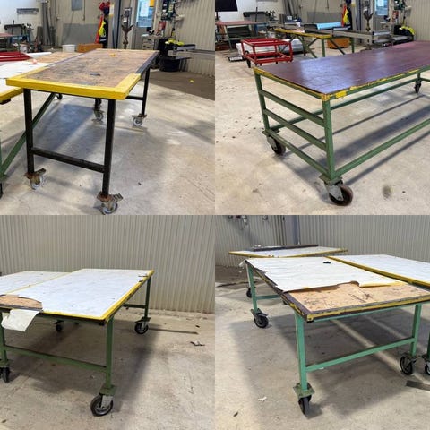 Verktygsbänk med rejäl arbetsyta på 250x80 cm och ett skruvstäd monterat. Plåtkant i bakkant så att skruvarna inte ramlar ner. Bastanta ben i plåt som är justerbara.