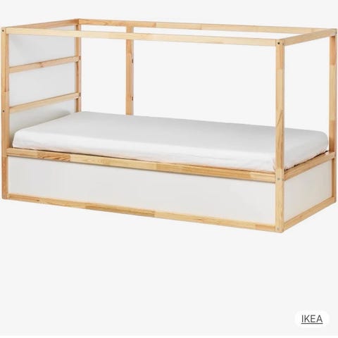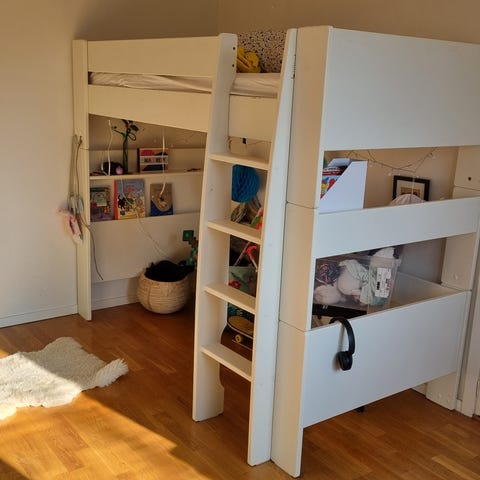 IKEA Loftsäng barnmöbel tillverkad i trä. Sängen är avsedd för barn men en vuxen och barn kan gott sova i den. Benen är kapade ca 10 cm.