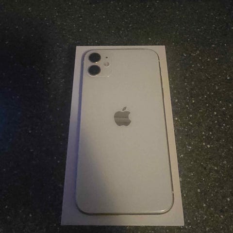 Apple iPhone 11 med 64 GB lagringskapacitet. Mobiltelefon med en skärm som visar "hello" och en baksida i grön färg med två kameror. Enheten är designad för allmän användning och har funktioner som passar dagligt bruk.