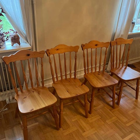 Säljer två tidlösa och robusta stolar i massiv furu som ger en varm, naturnära känsla till hemmet. Stolarna har en klassisk design med ribbad rygg och en vacker patina som bara trä kan få som ni ser på bilderna. De är väl omhändertagna så de är stabila och håller många år till. De kan hämtas från Tunabackar, Uppsala.
