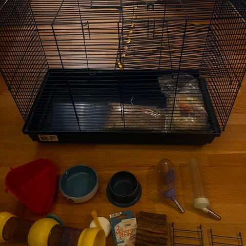 Det mesta till en dvärghamster. Bur, hjul, rastgård, transportbur m.m