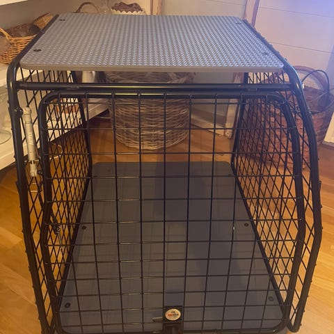 Transportbur för medelstor hund, avsedd att användas främst i bil. Buren har reglerbar storlek mellan 77 till 103 cm, utvändig längd. Låsbar där en nyckel ingår. Rester av dubbelhäftande tejp på golvet invändigt. Modellen av bur är krocktestad och den kan evakueras framåt vid en olycka. Buren finns att hämta i Umeå.