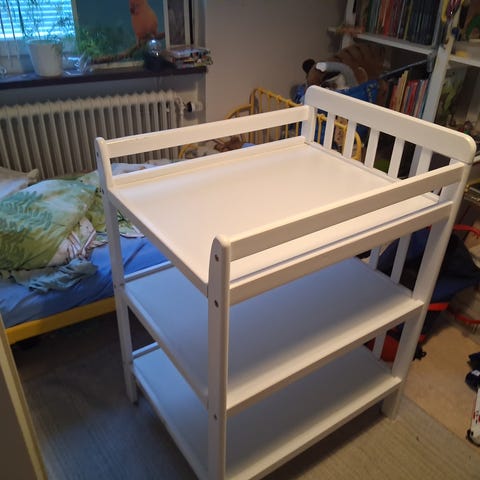 IKEA barnmöbel skötbord i vit trä. Har tre nivåer för förvaring och användning. Funkar fint, kanske lite avskavd färg här och var. Finns även två åkpåsar, ett babygym och lite bebisleksaker om någon vill ha. Allt gratis! Hämtas i Högdalen.