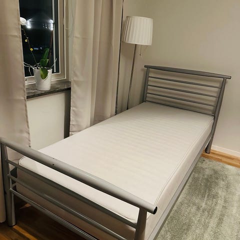 Sängram med madrass i storleken 90x200 cm. Ramen är klädd i svart tyg med texturerad yta. Madrassen är vit med svart kantband och har en tjocklek som syns på bild. Passar för enkelbädd.