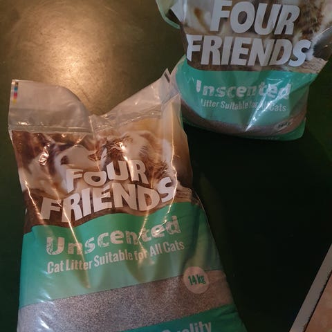 Säljer ekologisk kattsand med tillsatta sojafibrer.