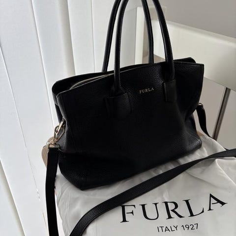 Furla väska tillverkad i läder, avsedd för kvinna. Väskan har en svart färg och en justerbar axelrem. Den har en dragkedja för stängning och en inre märkestagg. Passar för vardagligt bruk och kan rymma personliga tillhörigheter. Stl 34x24 cm