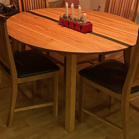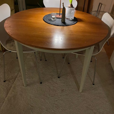 Bordsskivan har fläckar och märken, men kan slipas och behandlas på nytt om det är något som stör en.