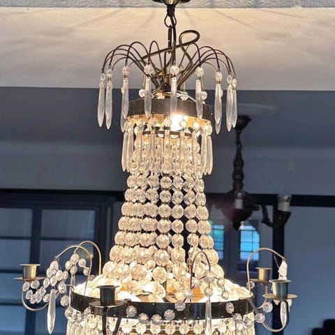 En jätte fin lampa . En gammalt kristallkrona med stora prismor och mässing
