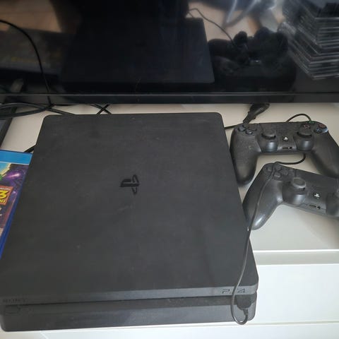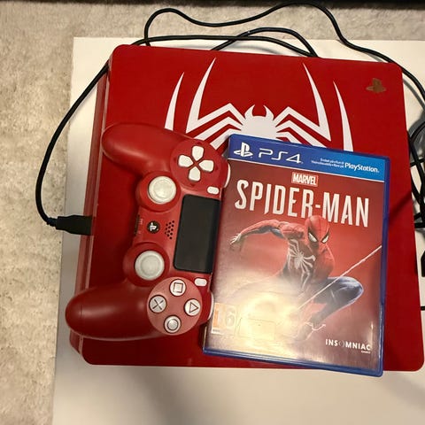 Sony Playstation 4 från 2018 med tillbehör inklusive två handkontroller och fem spel: Spider-Man, FIFA 18, Need for Speed Payback, Crash Bandicoot N. Sane Trilogy och The Sims 4.