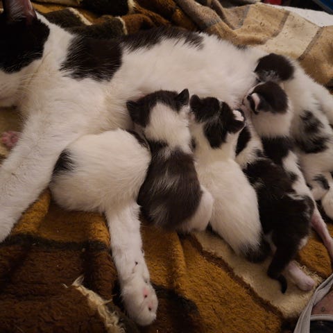 De två hanarna är svartvita och honan sköldpaddsfärgad. Lilla gumman föddes utan sin ena baktass, men klarar fint att både gå, springa och klättra ändå, vi tror inte att detta kommer bli något problem för henne.