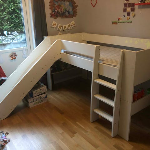 Loftsäng i vit trä med rutschkana (sängen är anpassad för madrass på 90x190 cm). Måtten är 198 cm lång, 97 cm bred och 75 cm hög. Rutschkanan är 141 cm lång och sängen har en stege med 3 steg.
