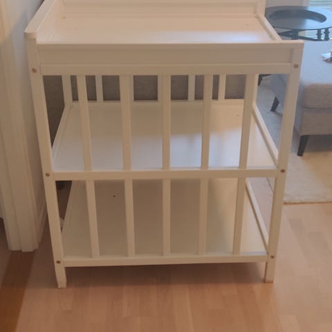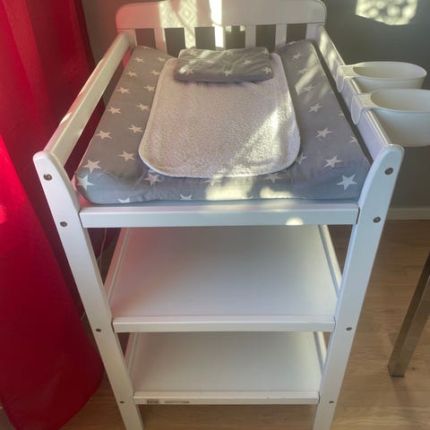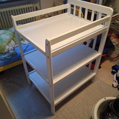 Ger bort skötbordet på bilden. Funkar fint men kanske lite avskavd färg här och var. Finns också två åkpåsar, ett babygym och lite bebisleksaker om någon vill ha. Allt gratis, hämtas i Högdalen.