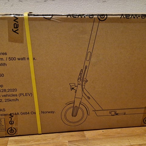 E-Way E-5045FS elsparkcykel med svart ram och handtag. Utrustad med en plattform för fotstöd och handbroms. Lämplig för persontransport på kortare sträckor.
