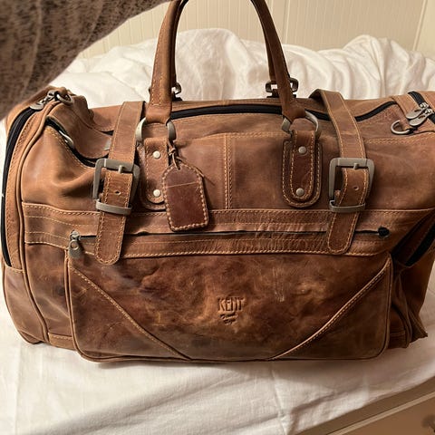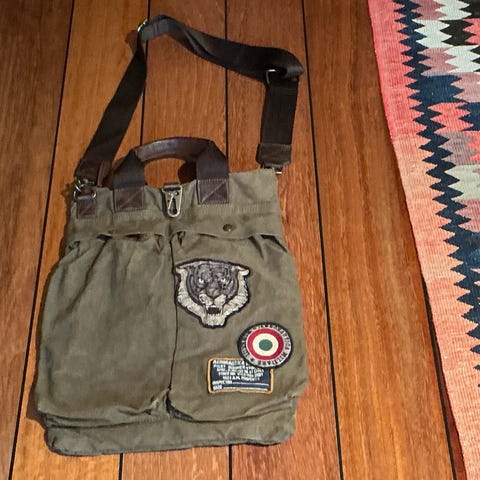 Svart och beige väska med justerbara remmar och dekorativa spännen. Väskan har ett emblem med texten "N.Z.A New Zealand Auckland" och en Nya Zeelänsk flagga.