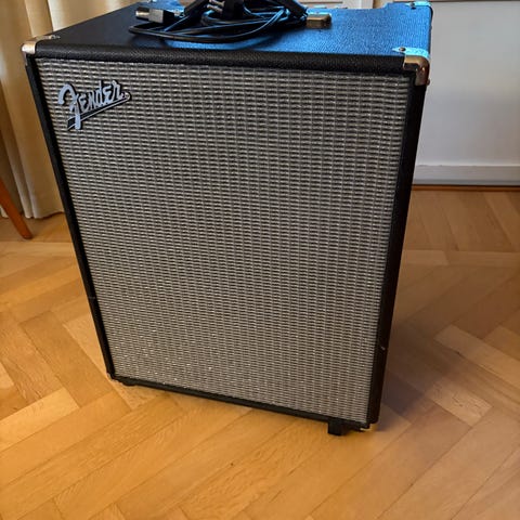 Fender Rumble 300 är en basförstärkare med flera reglage för volym, bas, mellanregister och diskant. Den är svart med ett grått frontgaller och har ett handtag för bärbarhet. Förstärkaren är utrustad med anslutningar på baksidan för olika ljudkällor och har en kompakt design lämpad för basgitarr.