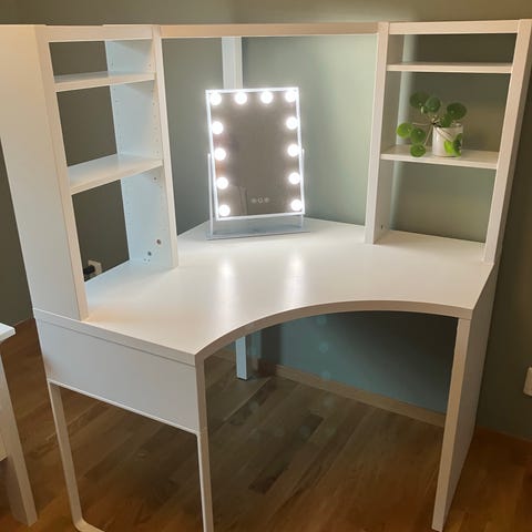 Nätt hörnskrivbord med utdragbar tangentbordshylla.