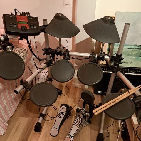 Yamaha DTX400K elektroniskt trumset med flera trumplattor och cymbaler.