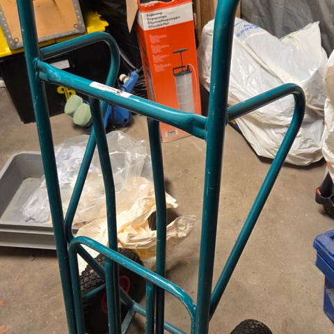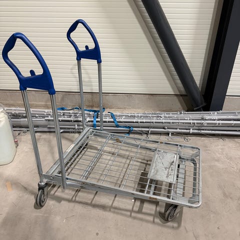 handvagn i gul färg tillverkad av stål. Handvagnen har hjul och är avsedd för att underlätta transport av tunga eller skrymmande föremål.