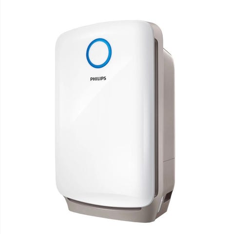Philips luftluftrenare i vit färg med cylindrisk design. Utrustad med ett inbyggt filter och kontrollpanel på toppen. Passar för att förbättra luftkvaliteten i hemmiljöer.