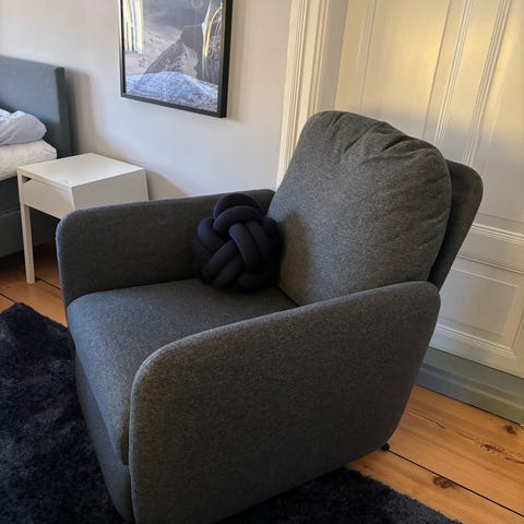 Fåtölj med träarmstöd och mörkgrå tygklädsel. Passar för vardagsrum eller läshörna. Stolen har en stabil träram och en bekväm sittdyna i tyg.
