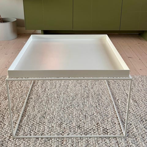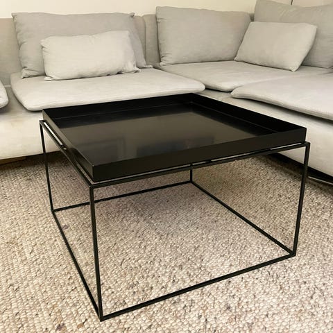 Hay bord i svart metall med en rektangulär bricka och minimalistisk design.