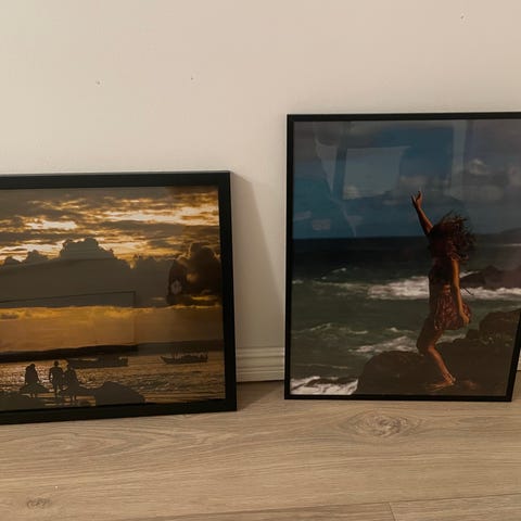 Svart ram med passepartout som omger en svartvit bild av en segelbåt på vattnet. Ramen är av massivt trå. Storlek 58x58