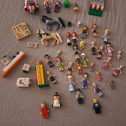 LEGO Friends ca 1,6 kg från flera byggen, tror inte någon är komplett men har inte lagt tid på att gå igenom :) nog relativt nära i alla fall i något av fallen. Väldigt mycket med många figurer med flera minifigurer, djur, fordon och olika tillbehör. Innehåller byggbara delar i olika färger och former, inklusive en pool med rutschkana, möbler och växter. Se bilderna