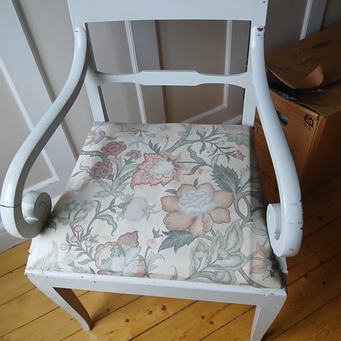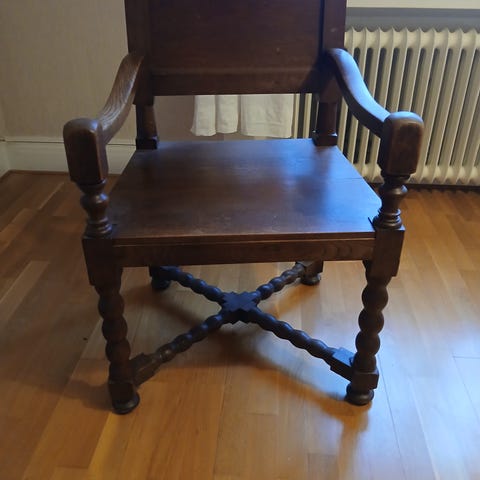 KARMSTOL, s.k ”Munkstol", 1900-talets första hälft. Snidad dekor, med löst liggande sittkudde.