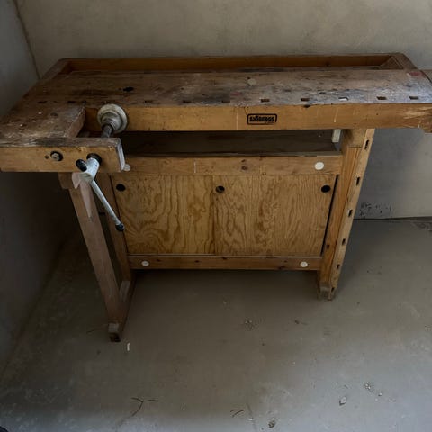 Slöjdbänk, sk ”trähäst” för hantverk i trämaterial. Justerbar tving för att kunna klämma fast olika ämnen. Hämtas, skickas ej.