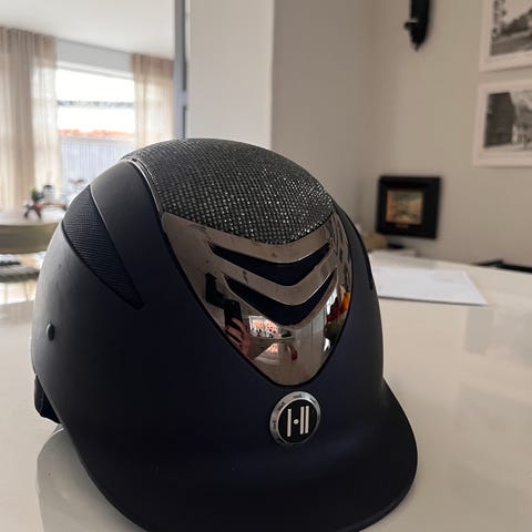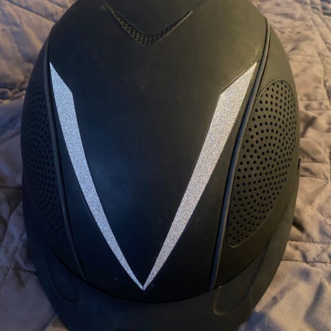 CRW ridshjälm i svart färg med ventilationsöppningar för bättre luftflöde. Hjälmen har justerbara remmar för säker passform och är designad för ridning.