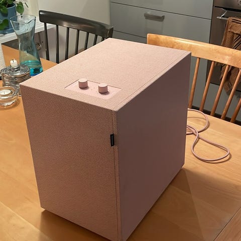 Baggen Urbanears multiroom högtalare i svart färg. En enhet för att förbättra ljudupplevelsen med djupare bas. Har anslutningar och reglage på ovansidan för justering av ljudnivå och anslutning till ljudsystem.