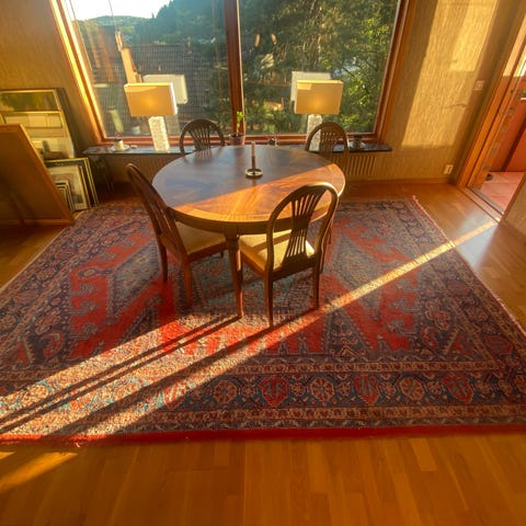 Säljer en persika matta som är köpt på Göteborgs auktionskammare men aldrig funnit sin rätta plats i vårt hem