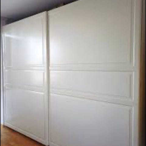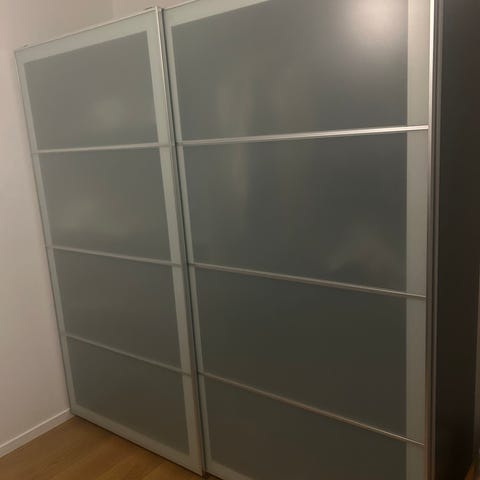 pax garderob med skjutdörrar i svart och i fint skick med hyllor. klädhängare