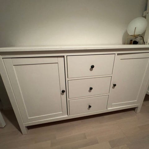 Stabil vit skänk, tre lådor och tre skåp med varsitt hyllplan
