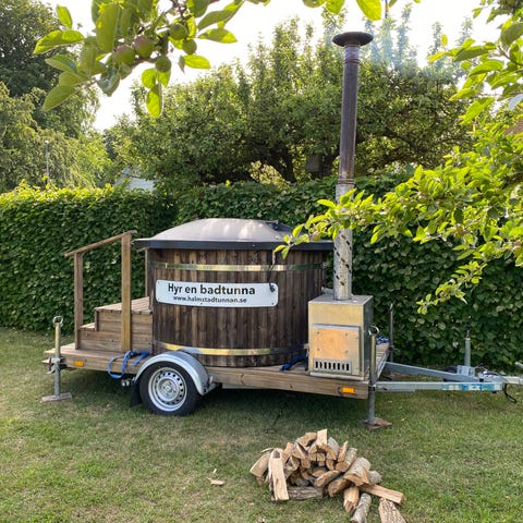 Mobilt badtunna i trä med trailer