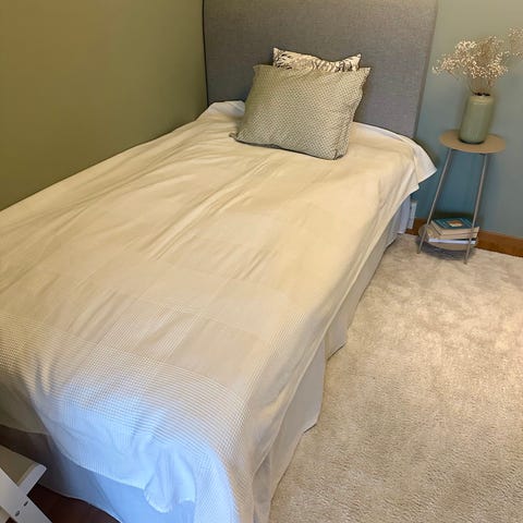 En bäddmadrass av Hilding Harmony (svanenmärkt) följer med. Ytskiktet på bäddmadrassen är nytvättat men ser lite tråkigt ut så det kanske man vill byta ut (därav priset).