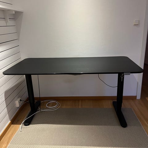 Höj-och sänkbart skrivbord från IKEA. Elektriskt. Bordsskiva i oljad ek och svarta stålben.