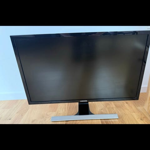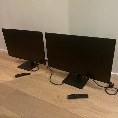 Vit Samsung Smart Monitor M5 27-tum. Integrerade appar för streamingtjänster och fjärrkontroll. HDMI-anslutning.