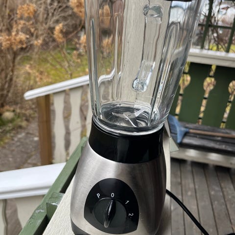 Anders Petter Mixer med glasbehållare. Utrustad med en vridbar reglageknapp för hastighetskontroll. Glasbehållare med måttangivelser. Passar för blandning av olika ingredienser i köket.