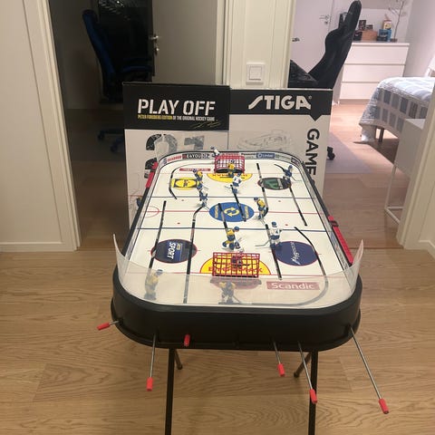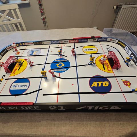 Komplett Stiga NHL bordshockeyspel på stativ. Bra skick, Philadelphia och Detroit, två extra lag medföljer (Toronto och Boston).