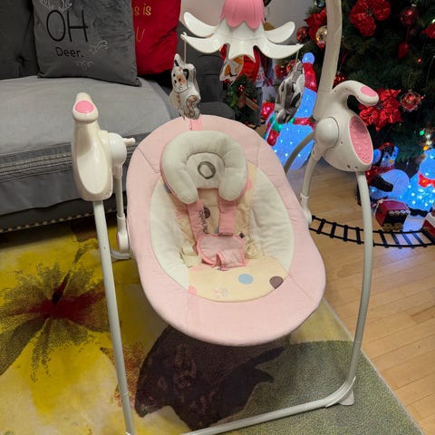 Chicco babysitter i fint skick. Mjuk och bekväm med säkerhetssele och lekbåge med söta leksaker. Stabil, trygg och perfekt för vila och lek från nyfödd. Lätt att flytta och enkel att använda.
