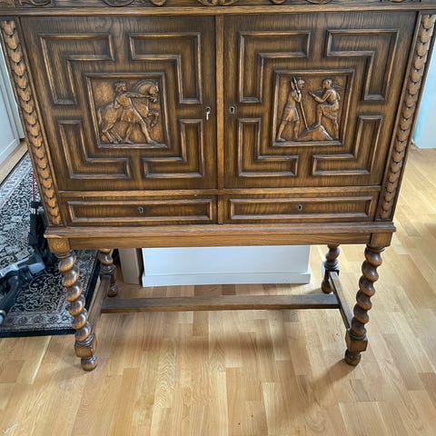 Antikt skåp med integrerad spegel och flera hyllor, troligen från tidigt 1900-tal. Tillverkat i trä med dekorativa detaljer. Passar för förvaring och som möbel i vardagsrum eller hall.