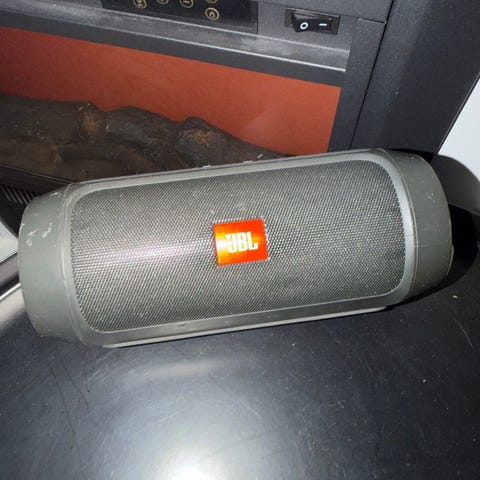 Svart JBL Boombox Bluetooth-högtalare. Bärbar högtalare med inbyggt handtag för enkel transport. Utrustad med kontrollknappar för ljud och uppspelning. Levereras med laddningskabel.