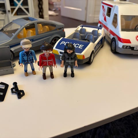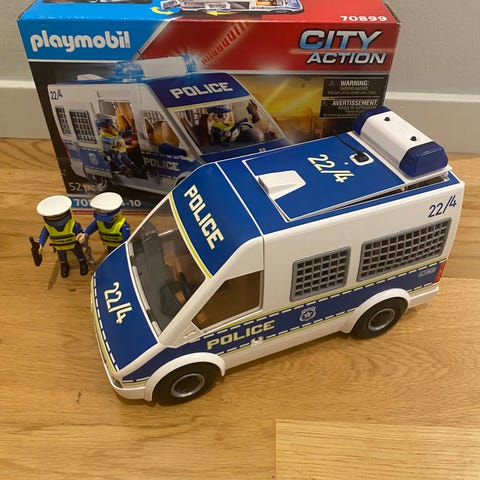Playmobil polisbil med en medföljande polisfigur med lite tillbehör. Tyvärr fungerar ej blåljuset.