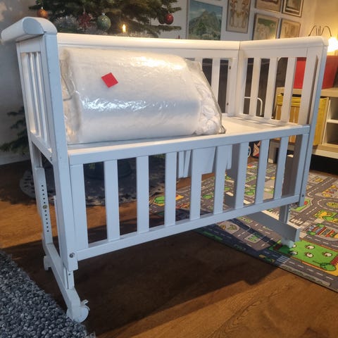 Troll Sun Bedside Crib barnmöbel i vitt med fin madrass.