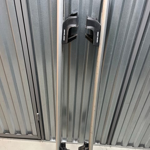 Har två par lasthållare med fästen för bilar med upphöjda rails. Finns även en uppsättning fästen för låga rails typ Audi, VW. Bra skick enligt bilder.