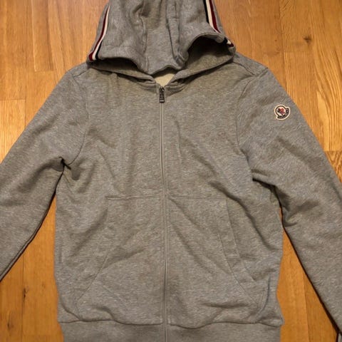 Moncler herrtröja i grå färg, tillverkad av ull. Tröjan är storlek S och har en dragkedja framtill samt huva. Passar för vardagligt bruk och erbjuder värme och komfort.