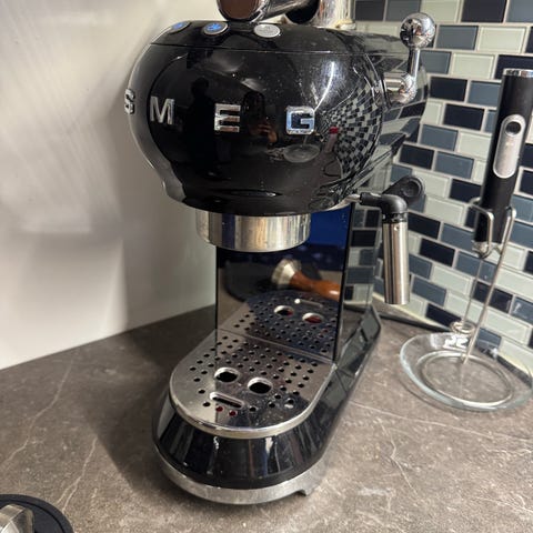 Smeg Kaffemaskin i vit färg med flera dryckesval och inbyggd mjölkskummare. Maskinen har en kompakt design med kontrollpanel för olika kaffestyrkor och en avtagbar droppbricka.
